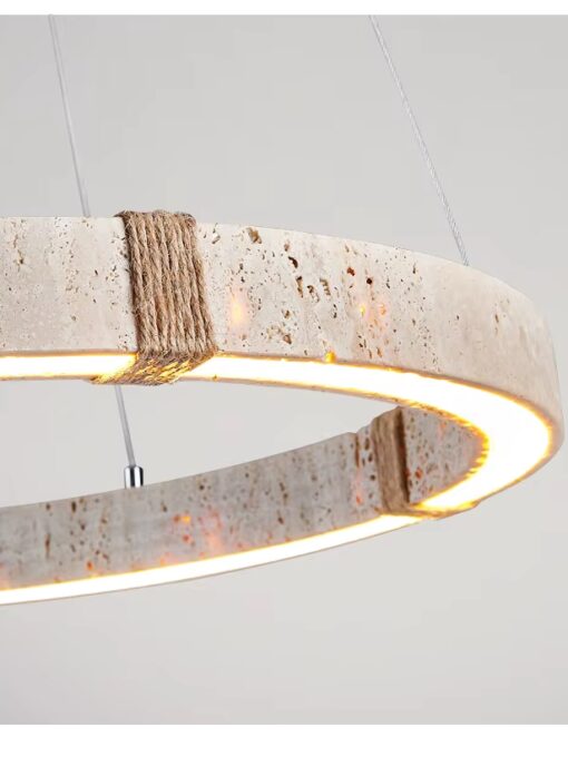 Veredeln Sie Ihr Zuhause mit diesem Kronleuchter aus natürlichem Travertin, der einen Durchmesser von 40 cm hat. Sein raffinierter, 4 cm hoher Ring hebt die raue Schönheit des Steins hervor und verleiht Ihrer Dekoration einen mineralischen und zeitgenössischen Touch. Er hängt an drei bis zu 150 cm verstellbaren Seilen und eignet sich sowohl für Standarddecken…
