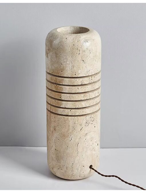 Bringen Sie mit dieser Designer-Tischlampe aus Travertin einen skulpturalen und natürlichen Touch in Ihr Zuhause. Die 50 cm hohe Stehleuchte mit einem Durchmesser von 17,5 cm zeichnet sich durch ihre zylinderförmige, aus Stein gearbeitete Silhouette mit feinen Lichtöffnungen aus, die ein weiches, warmes Licht ausstrahlen. Die Lampe ist mit einem 150 cm langen, geflochtenen Stromkabel…