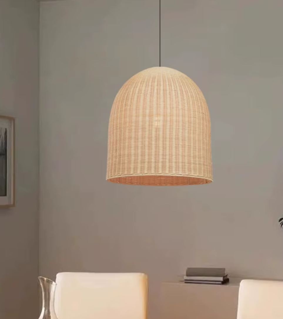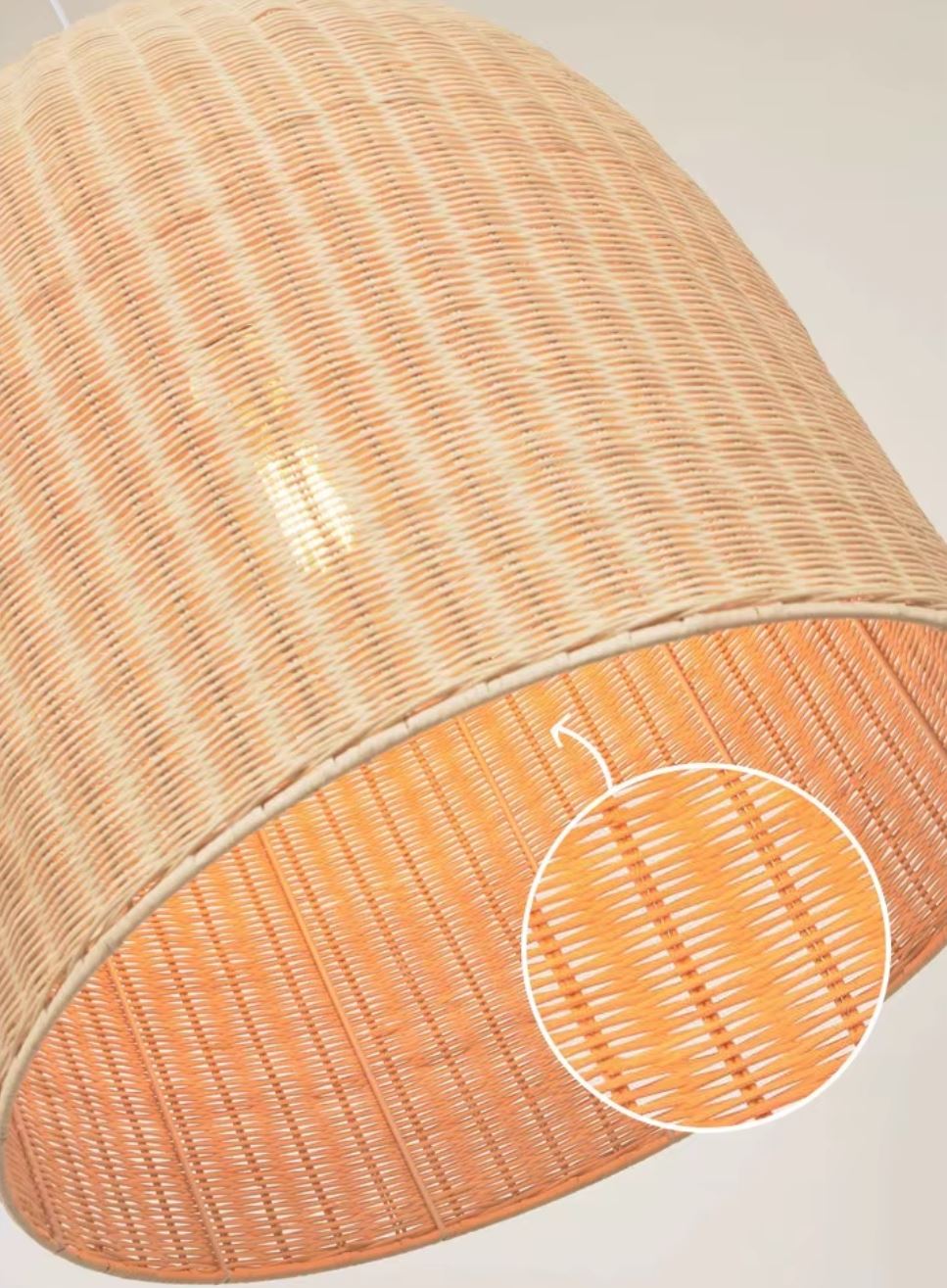 Bringen Sie Wärme und Authentizität in Ihr Zuhause mit dieser eleganten, glockenförmigen Hängeleuchte aus Rattan. Das natürliche Geflecht und die runde Form von 40 x 45 cm verbreiten ein weiches, gedämpftes Licht, das ideal ist, um eine gemütliche Atmosphäre in einem Wohn-, Ess- oder Schlafzimmer zu schaffen.