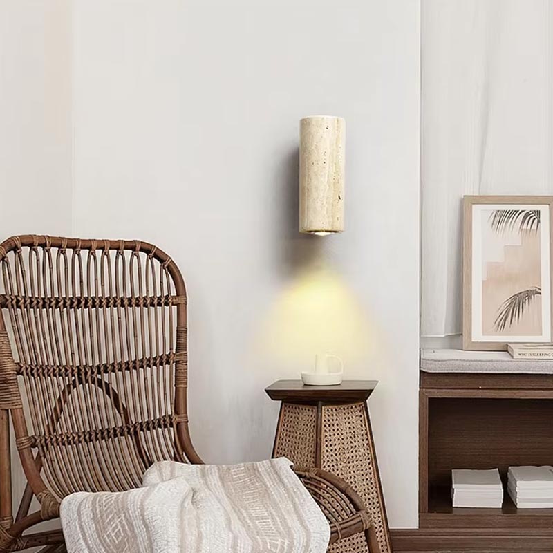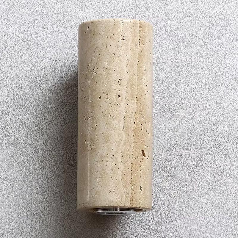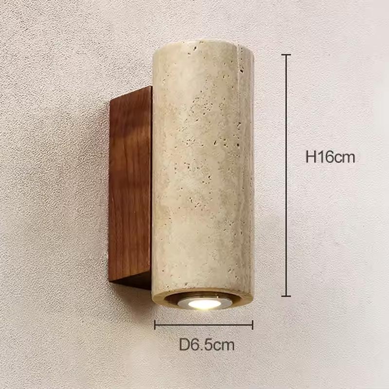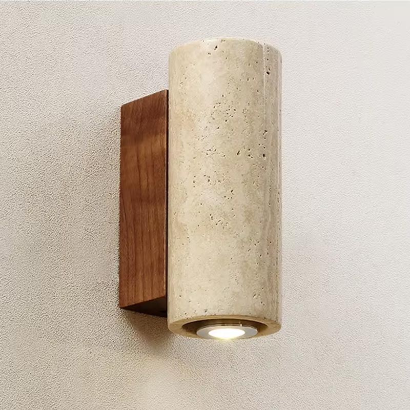 Bringen Sie mit dieser Wandleuchte aus Travertin und Holz einen raffinierten Bohème-Touch in Ihr Zuhause. Ihr zylindrisches Design verbindet den edlen Charakter des natürlichen Travertins mit der Wärme des Holzes und wirkt dadurch authentisch, minimalistisch und zeitlos zugleich.